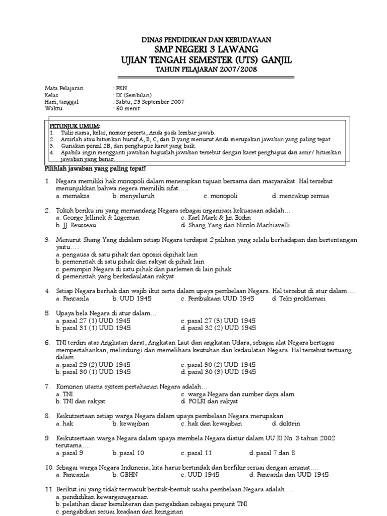 1 1 pengertian upaya pembelaan negara adalah… ► 2012 (29). Soal fiqih kelas 7 semester i. Hal ini memengaruhi proses produksi dan penyebaran tenaga kerja internasional. Menjauhi teman yang kurang mampu 27. Maka berdasarkan hal tersebut pada artikel kali ini, saya akan menshare mengenai soal latihan usbn smp pkn kelas 9 beserta 10.